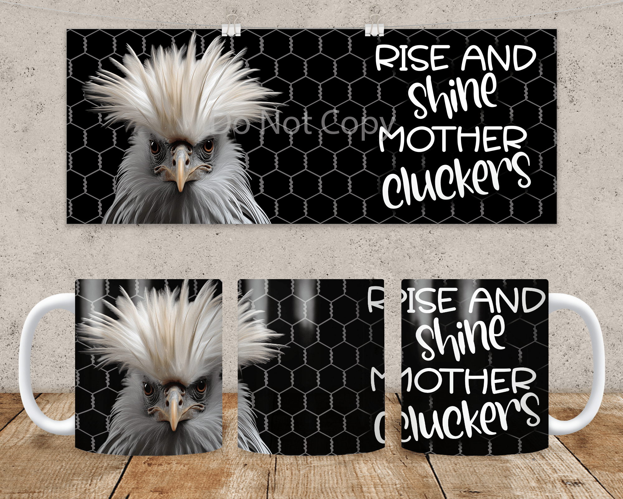 Funny Rise and Shine Mother Cluckers full mug wrap is the perfect way to start your day. This sassy mug wrap features a very earnest looking silkie chicken on a chicken wire fence black background with white lettering.